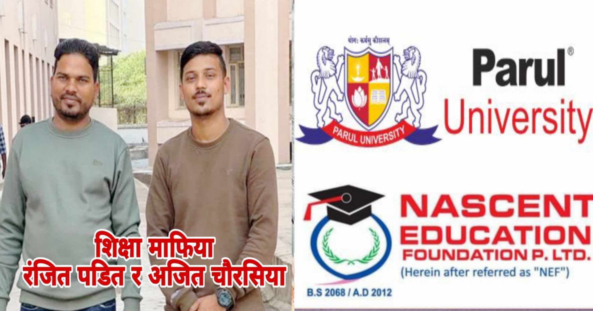 पारुलमा पर्सा, बारा, रौतहटका विद्यार्थीहरुलाई भर्ना गराउने आधिकारिक ठेक्का लिएका नेसेन्ट एजुकेशन फाउन्डेसन प्रा.लि. वीरगंजले विद्यार्थी र अभिभावकहरुलाई गुमराहमा राख्दै आफ्नो दुनो सोझ्याउने गर्ने गरेको बताईन्छ । वीरगंज घण्टाघर लिंकरोडमा स्थित नेसेन्ट एजुकेशनका सञ्चालक रंजित पडित, सह–सञ्चालक अजित चौरसिया र सहयोगी लालमहम्मद अंसारी लगायतकाले नेसेन्टको नाममा ठगी गर्दै गरेको र पारुल युनिभर्सिटी लगायत अन्य युनिभर्सिटीको नाममा नक्कली सर्टिफिकेट पनि बनाउने गरेको समाचार स्रोतको कथन रहेको छ ।