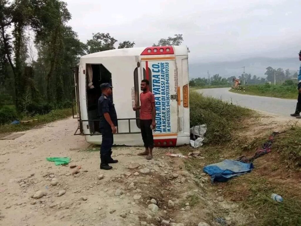 काठमाडौंबाट भारतको राजस्थान जाँदै गरेको आरजे १४ पीसी ३४४५ नम्बरको बस गएराती करिव २ बजे तिर दुर्घटनामा परेको हो । चालकले नियन्त्रण गुमाई बस पल्टिएर दुर्घटना भएको नवलपुर प्रहरीले जनाएको छ ।
