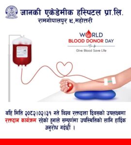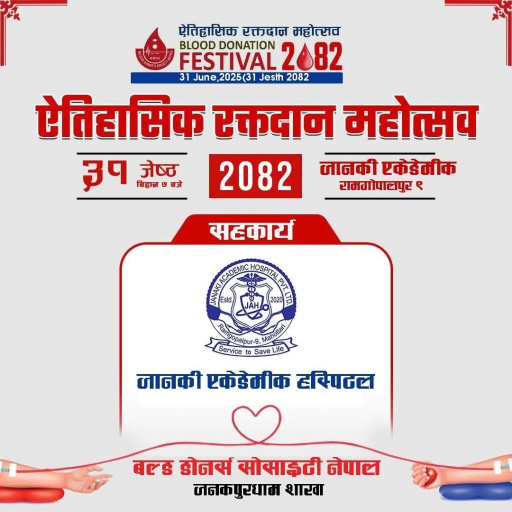 रक्तको अभावका कारण बिरामीहरूले उपचारमा कठिनाइ भोगिरहेका बेला जानकी एकेडेमिक हस्पिटल प्रा.लि., रामगोपालपुर–९, पर्सा देवाड, महोत्तरीमा एक विशेष रक्तदान कार्यक्रम आयोजना हुने भएको छ ।