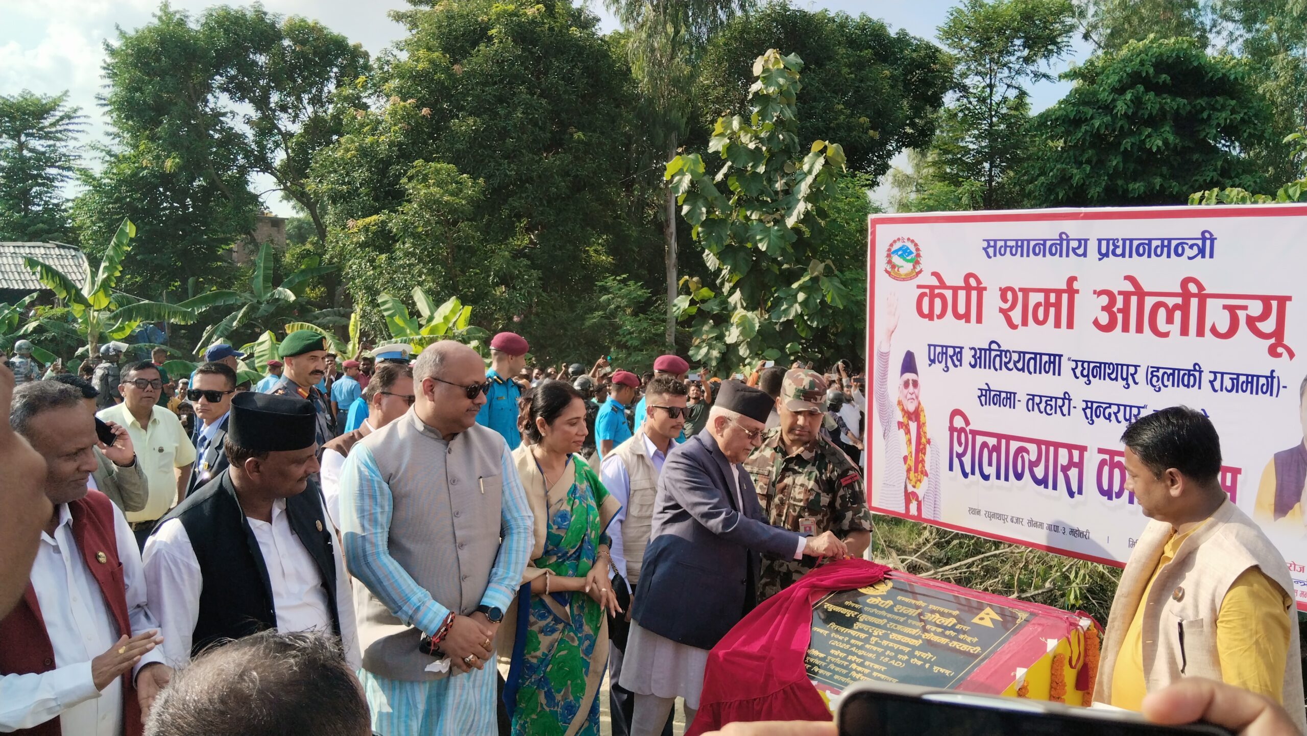 प्रधानमन्त्री केपी शर्मा ओलीले महोत्तरीको रघुनाथपुरमा कालाेपत्रे सडक निर्माण कार्यको शिलान्यास गरेका छन् । शुक्रबार आयोजित कार्यक्रममा उनले सोनमा गाउँपालिका–३ अन्तर्गत रघुनाथपुर–सोनमा–तरहारी–सुन्दरपुर सडक खण्डको शिलान्यास गरेका हुन् ।